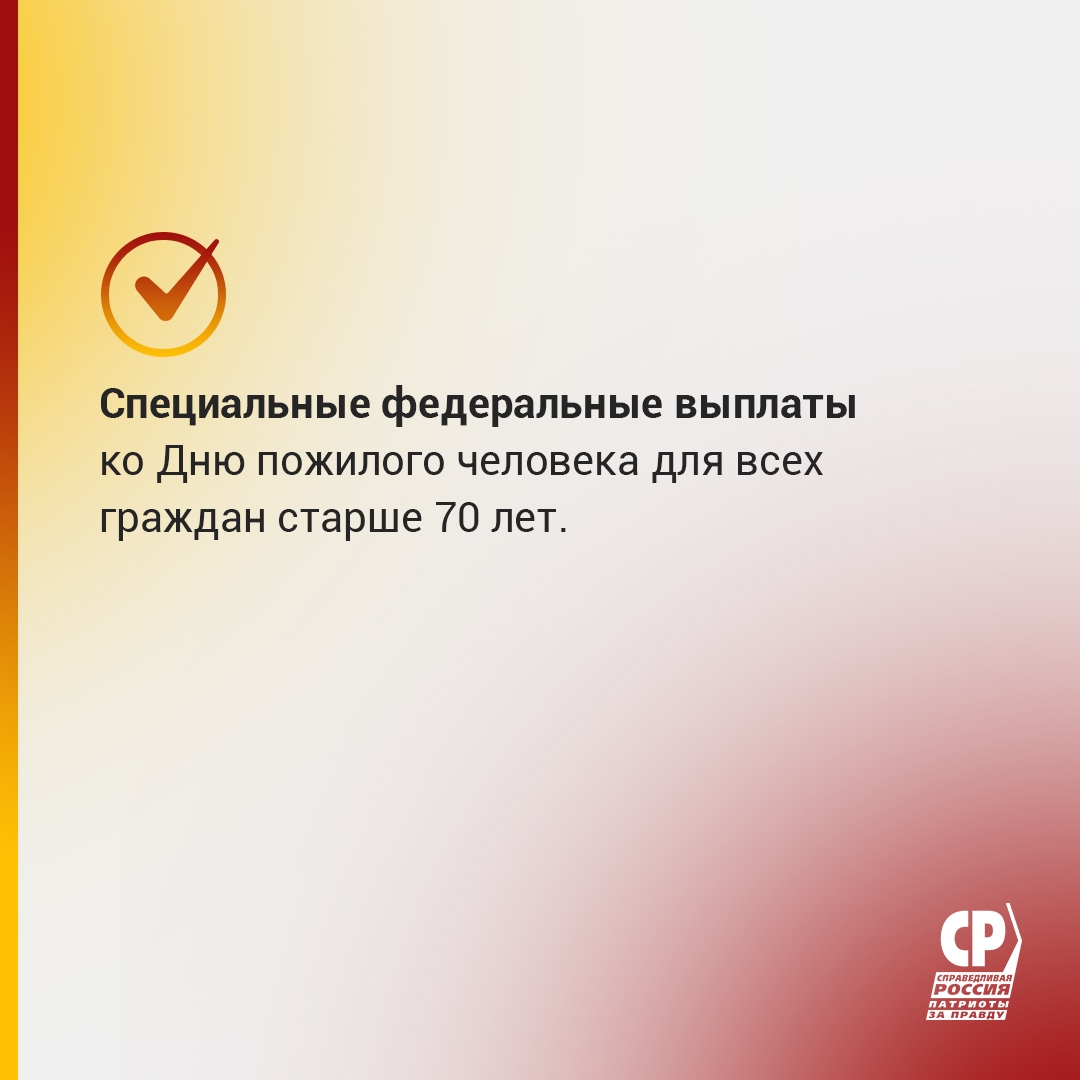 День пожилого человека – это не просто дата календаря, а напоминание обществу о важности заботы о старшем поколении. Именно поэтому партия разработала масштабный пакет СПРАВЕДЛИВАЯ РОССИЯ, направленных на улучшение качества жизни пожилых граждан нашей страны.