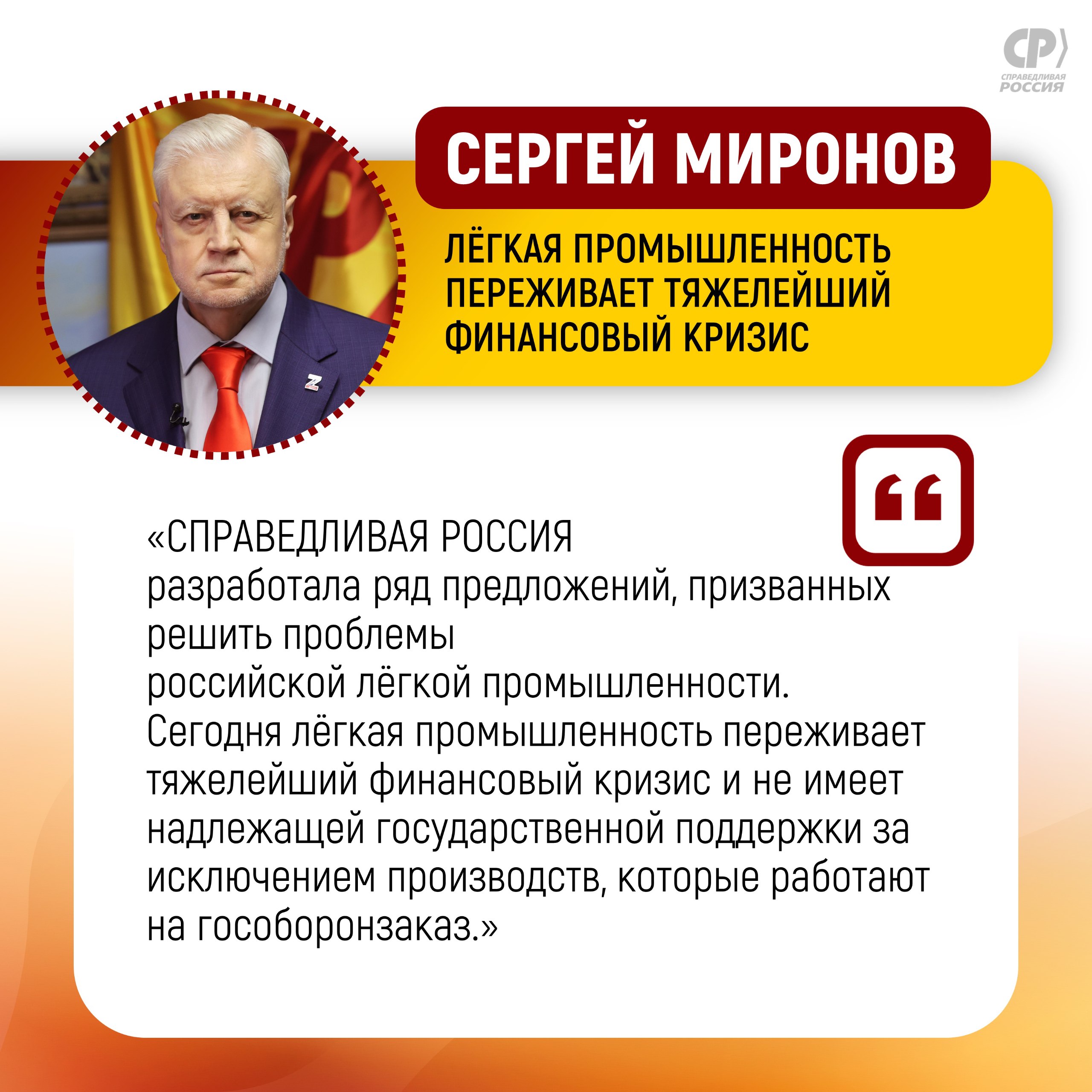 Друзья, вчера на парламентских слушаниях в Госдуме председатель СПРАВЕДЛИВОЙ РОССИИ Сергей Миронов в своем выступлении высказал мнение и предложения Партии в отношении происходящей ситуации в лёгкой промышленности.