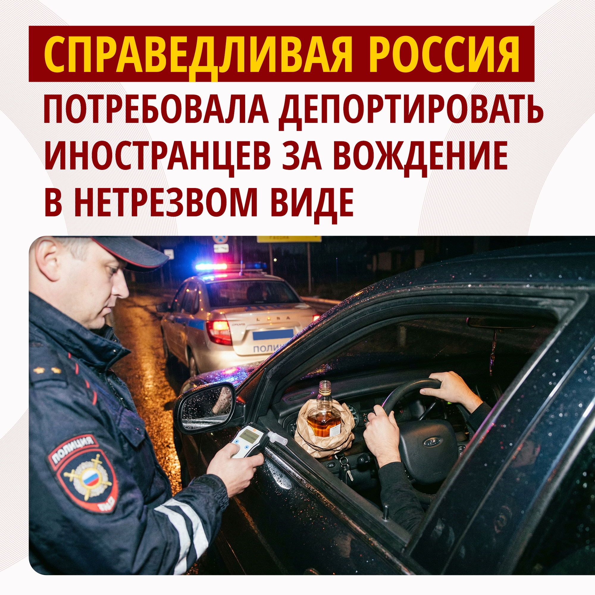 СПРАВЕДЛИВАЯ РОССИЯ потребовала лишать иностранцев разрешения на временное проживание за преступления, связанные с управлением автомобилем в состоянии алкогольного или наркотического опьянения.