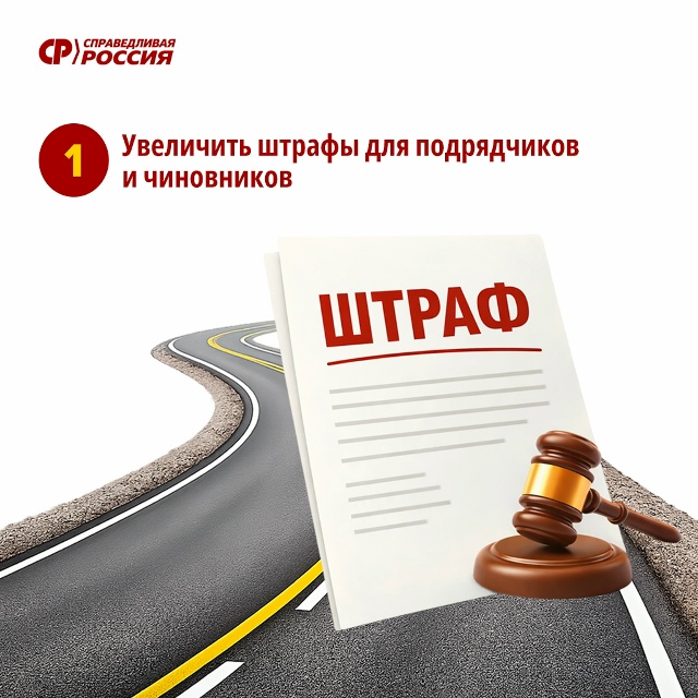 1⃣ Увеличить штрафы для подрядчиков и чиновников за некачественное строительство и ремонт дорог с 500 тыс. до 5 млн рублей.